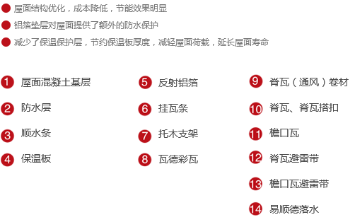 作為傳統(tǒng)屋面通風方案的優(yōu)化,鋁箔墊層的加入,使反射鋁箔與嵌入順水條間的保溫板形成空氣間層,代替了部分保溫板厚度,而且省去了保溫保護層。