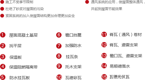 借鑒歐洲坡屋面防水理念,將平面防水改為立體防水,采用新型防水板材料,將材料防水和構造防水于一身,配合屋面系統(tǒng)組件,實現(xiàn)全天候全干作業(yè)。節(jié)省了屋面各類保護層次,打破了屋面冬季及雨后陰濕無法施工的常規(guī),縮短了工期,提升系統(tǒng)安全性能。